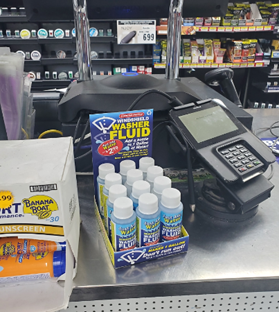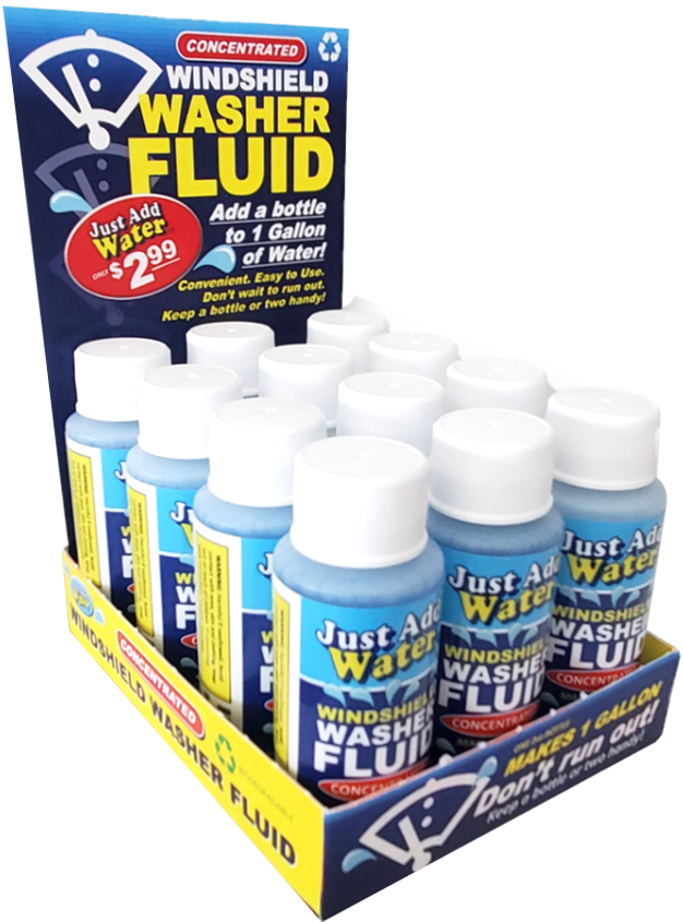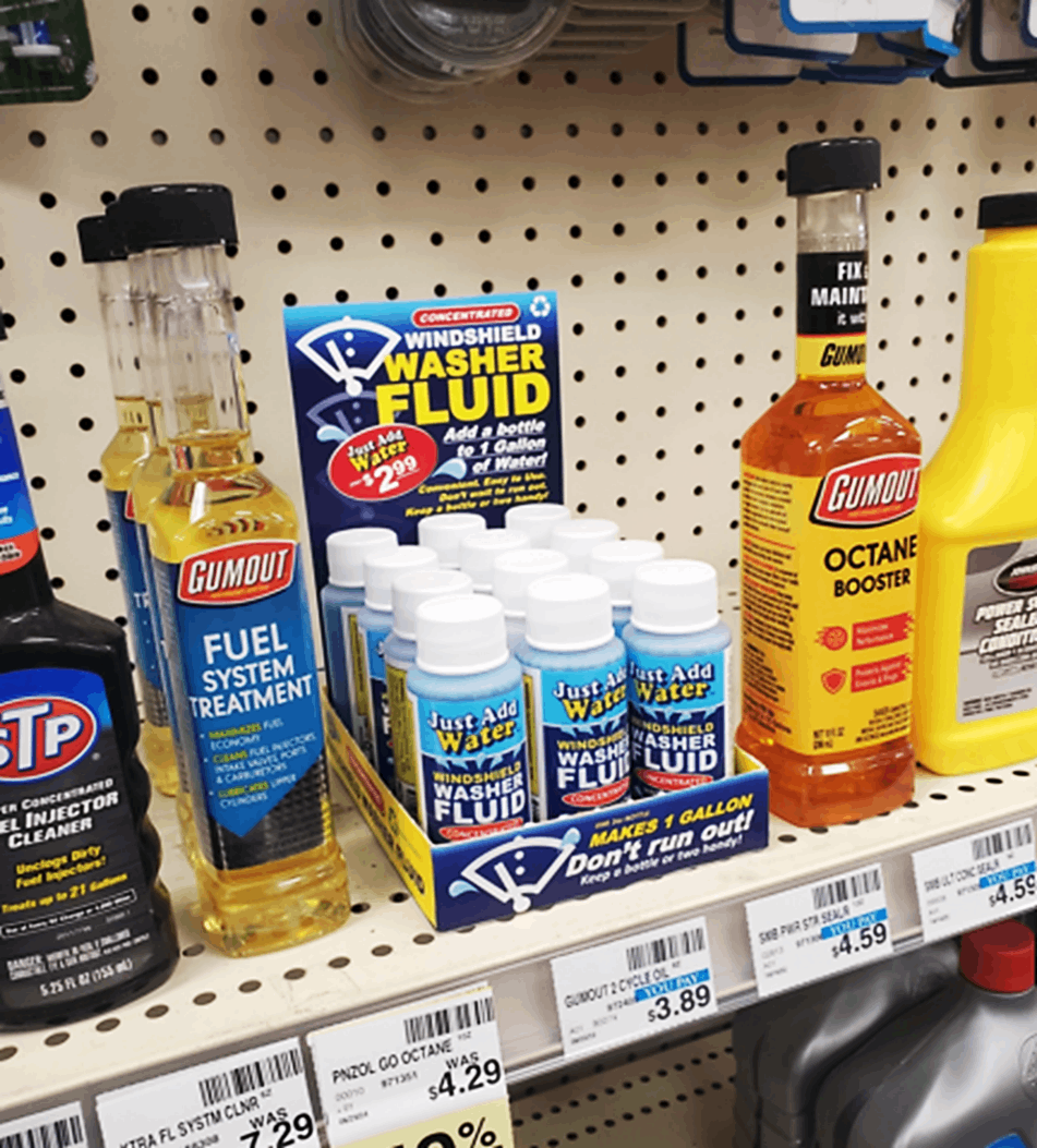 Retailers love us because they no longer must take up so much valuable shelf space stocking a few 1-gallon bottles when “Just Add Water” takes up only a fraction of that shelf space! Over 50 bottles of “Just Add Water” can fit in the same space of four typical 1-gallon containers of traditional washer fluids.